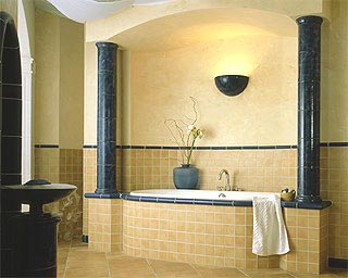 Wände oberhalb des Fliesenspiegels in Spachteltechnik Farbig sind die gespachtelten Flächen am Cotto-Ton der Fliesen orientiert, jedoch heller und leichter.