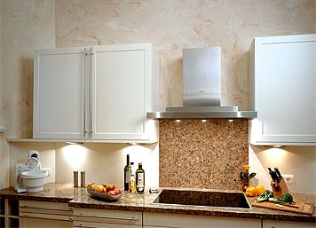 Meine polychrome Gestaltung der Wandflächen ist am Naturstein der Arbeitsplatte orientiert, mein Duktus ist jedoch leichter und dynamischer .