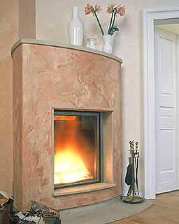 Im Raum herrscht ein heller, unaufdringlicher Aprikot-Ton. Die Wand zum Flur (links), hinter dem Kamin habe ich in einem kräftigen Cotto-Ton gehalten, gesteigert im Schornstein, gipfelt er in den geflammten Oxydrot - Tönen des Kamins.