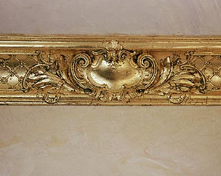 Fehlstellen durch Altanstriche sind bewusst beibehalten und ergeben so eine natürliche Patina. Fehlsstellen bei Hinterschneidungen, bzw. Tiefen unterstützen die Plastizität.